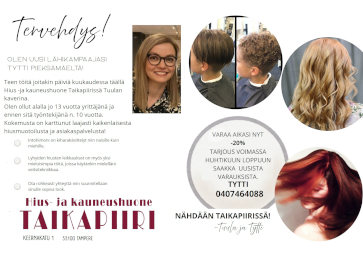 Hius- ja kauneushuone Taikapiiri sijaitsee Tampellan sydämessä Keernakadulla, aivan Tammerkosken läheisyydessä. Palvelemme teitä ammattitaidolla ja jokaista asiakasta kuunnellen.